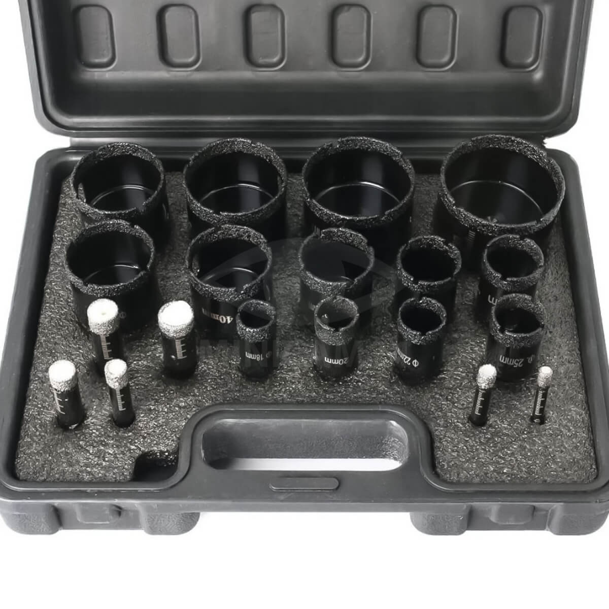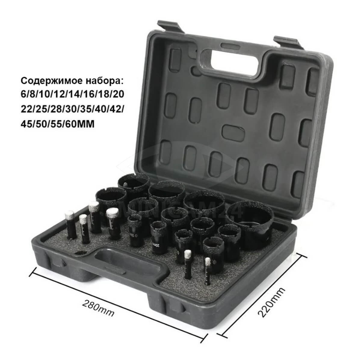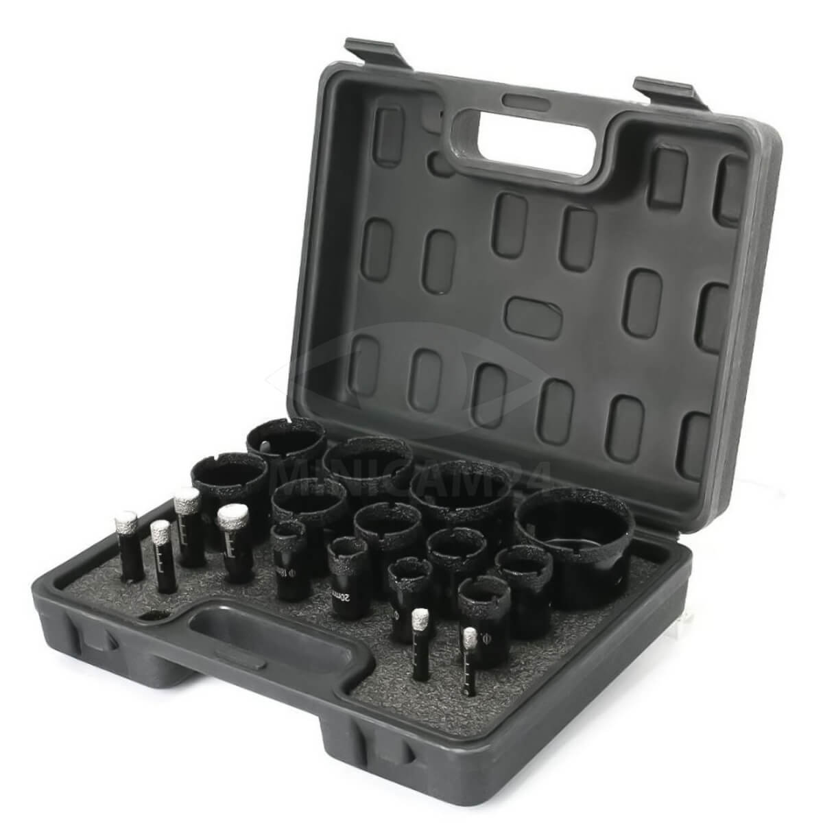 В комплекте портативный пластиковый кейс. Точное сверление может быть достигнуто без дополнительных инструментов. Данный набор подходит для мрамора, керамической плитки, гипсоволкна, кварцевого камня и стекла. Его можно использовать для декоративного сверления фасадов.